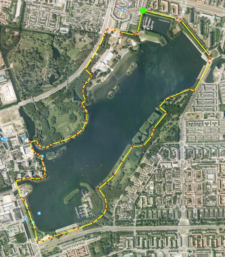 Meestal loop ik rondjes om de Sloterplas, bij ons in Amsterdam Slotermeer. De rondjes zijn vrij eenvoudig naar wens en behoefte langer en korter te maken en af te wisselen met steile heuvels en viaduct overgangen. Daarnaast loopt het vrij rustig, ver weg van het meeste verkeer. Een rondje dat ik vrij veel loop en wat hieronder is uitgetekend is 6,15 km lang. Vandaag heb ik er twee van gelopen in resp. 32 en 31 minuten. Het startpunt ligt bij de groene stip en ik loop altijd met de klok mee. De weg van huis naar het groene punt is iets meer dan een kilometer, mooi voor het in- en uitlopen.