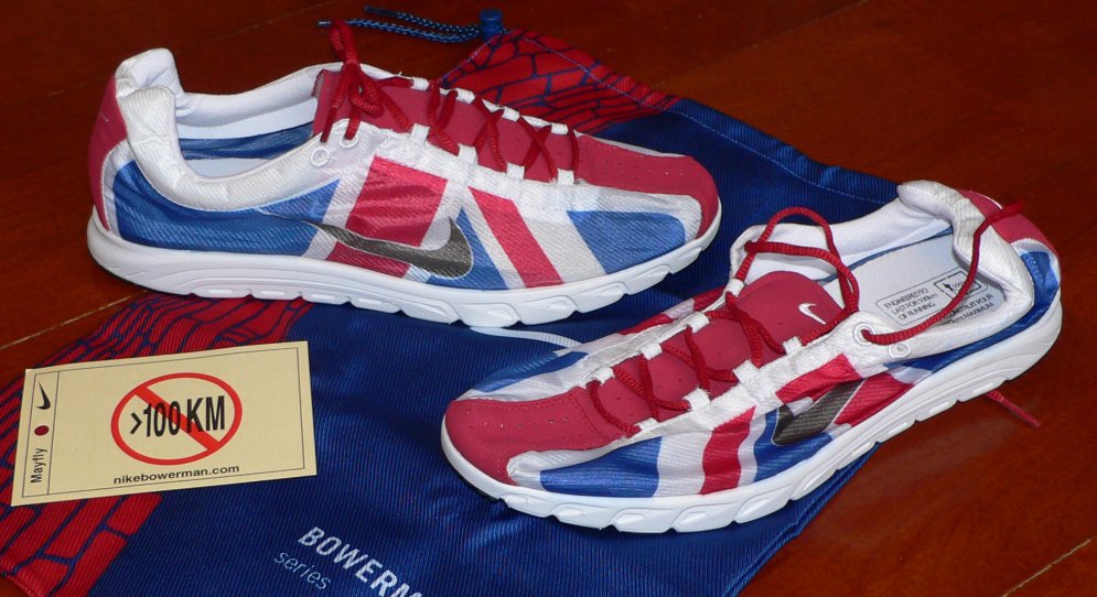 De verkoper had ook nog een stel Nike Mayfly's in de verkoop. Dit is misschien wel de meest gave hardloopschoen ooit. Hij is ontworpen volgens de gedachte van Nike oprichter Bill Bowerman dat raceschoenen je tot een meter na de finish ondersteuning en demping moeten bieden en niet langer. Iedere 100 gram aan extra gewicht in je schoenen kost, bij dezelfde prestatie, 1% extra energie. Deze schoenen wegen ongeveer de helft van een Vomero en zijn ontworpen voor een afstand van 100 km(!!!).De schoen zelf stelt niets voor. Het weinige rubber eronder is flinterdun, verder heb je eenvoudig dempingsmateriaal en een bovenwerk dat het het meest lijkt op synthetisch papier. Aan de achterkant van de hak zit een toefje versteviging en er zit wat alcantara in de neus en op de tong. Op de foto hierboven zit een ondersteunend stuk karton in de achterste schoen, de voorste is hoe de schoen er normaal uit ziet; als een verfrommelde krant.