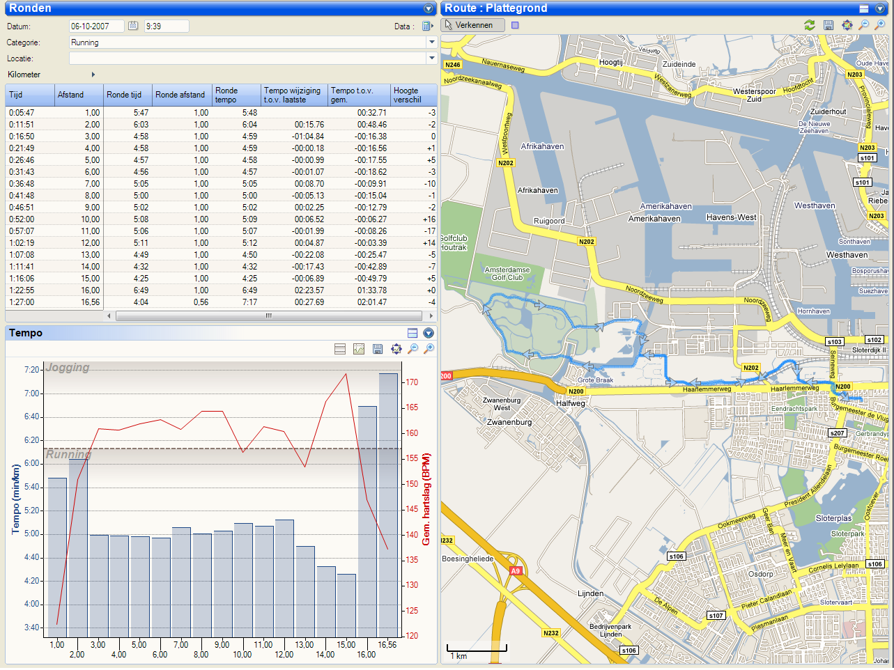 Hiernaast een weergave van de loop van afgelopen zaterdag. Aan de rechterkant een Google Maps achtige weergave van de route, links boven gegevens per kilometer en linksonder een grafiek van hartslag en snelheid. Goed zichtbaar is het in- en uitlopen en de versnelling aan het einde. Leuk om naar te kijken!
