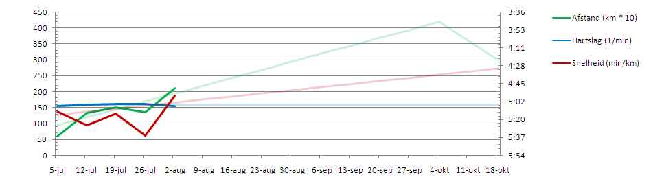 De duurloop van vandaag heb ik weer verwerkt in mijn zaterdag-duurloop-grafiek, zie hieronder. Een grote sprong vooruit, het geeft beter aan waar ik nu sta dan de loop van vorige week. Wat minder goed opvalt in de grafiek is dat ik, zoals hierboven ook al stond, met een behoorlijk lage hartslag heb gelopen.