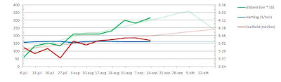 De drie lopen zijn weer verwerkt in de grafiek, zie hieronder. Wat betreft snelheid loop ik wat achter, dus daar ga ik me de komende tijd wat meer op richten. Het is wel zo dat de reden voor de lage snelheid mede zit in de vermoeidheid van mijn lijf, maar omdat het er op lijkt dat ik qua afstand wel goed uit kom, verleg ik de focus. Normaal gesproken loop ik de doordeweekse afstanden ook op rustig tempo, maar daar gaat het tempo ook wat omhoog. Daarnaast blijf ik natuurlijk de interval trainingen doen op de baan bij AAC.