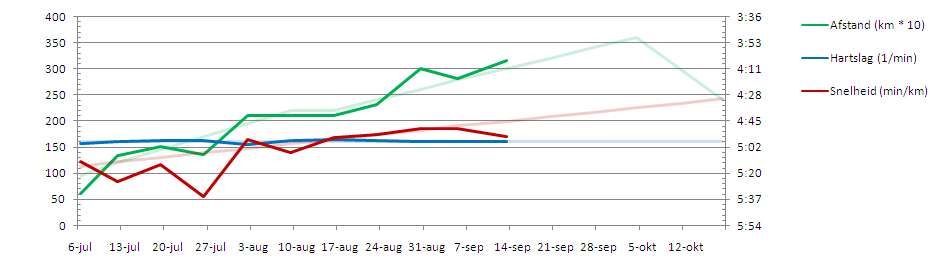 NB: Bij de afgelopen drie afstanden heb ik het in- en uitlopen bij de afstand meegerekend. Dat lijkt me zuiverder, omdat het gaat om de totale tijd/afstand.