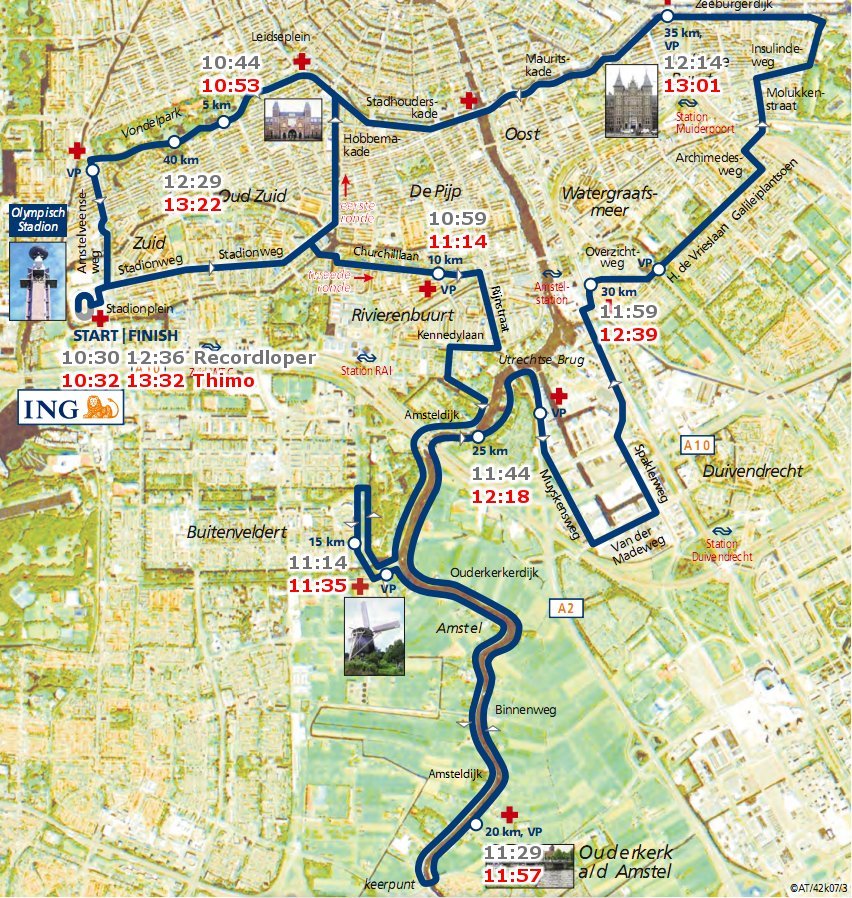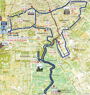 Ik start in de eerste groep na de toplopers, waarschijnlijk om 10:32, de finish volgt om 13:32. Dit samen met de tijden van het baanrecord heb ik uitgezet op de route voor de Amsterdam Marathon: