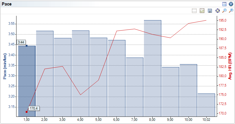 Hieronder een grafiek met de snelheid per kilometer en hartslag. De start was ietwat snel, verder een gekke 'inzinking' tussen 7 en 8 kilometer. Ik denk, maar kan het me niet herinneren, dat het daar omhoog liep. Direct erna ging het in ieder geval wel omlaag, wat je terug ziet in de snelheid op de 9de kilometer. De laatste kolom is trouwens slechts over 20 meter, de echte eindsprint. De dip in de hartslag na drie kilometer was een meetfout, de band was naar beneden gezakt.