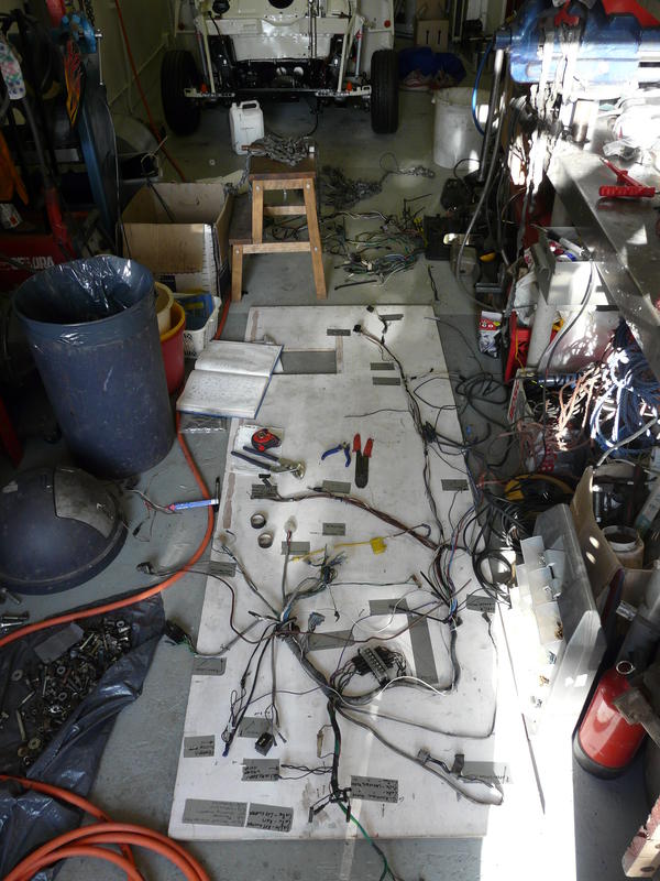 Zie links de warzone. De meeste spullen liggen op de grond. Op de witte plaat is de draadboom gespijkerd. Dat de boom hierop vast zit is een groot voordeel bij het werken eraan, het houd het overzichtelijk. Zeker met een deel van de omhulzing verwijdert kan het snel een rommetje worden. Op de plaat zijn stukken grijs plakband geplakt. Hierop heb ik eerst geschreven waarvoor ieder deel van de boom bedoeld was, vaak ook met beschrijving van de draden met kleur en doel. Losse draden zijn daarnaast nog eens gelabeld met een soort van tie-wraps waar kleine plastic kaartjes aan zitten. Die tie-wrap-labels zijn hopelijk handig bij het monteren van de boom in de auto.