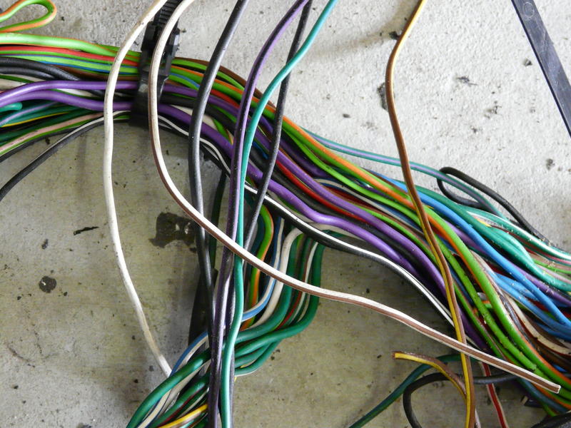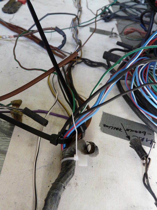 Rechts een detail opname van de boom. Al komt het op de foto niet zo naar voren, het is fantastisch om al die kleuren en diktes in draden bij elkaar te zien. Dit deel is wat op het schutbord rechtsboven komt te zitten, met de aftakking voor de koplampen en knipperlichten. Rechtsonder in beeld de stekker voor de aansluiting van de brake-failure-switch, voor op de hoofdremcilinder.