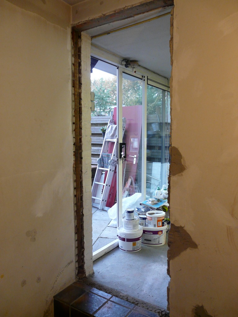 Op de eerste foto de nu behoorlijk opgeschoonde hoek met de CV-ketel. Dat ziet er al veel beter uit dan voorheen. Op de tweede foto de doorgang van het berghok naar de garage. Hierin komt een nieuw, breder kozijn met daarin een deur met glas (derde foto). In de doorgang zoals te zien op de eerste foto komt ook zo'n deur, maar dan opgehangen als schuifdeur en aan deze kant van de doorgang. Die andere deur verdwijnt.